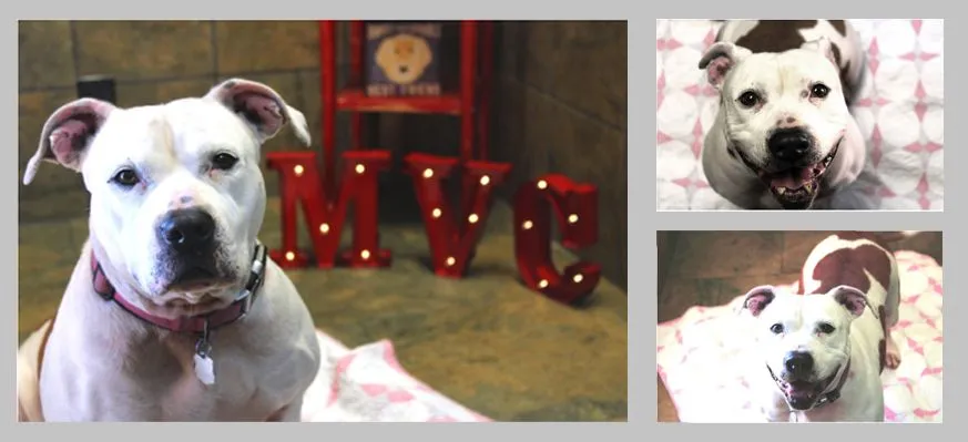 I have many foster cats, and Ginger is well-behaved with them. They like to sleep next to her when it's cold, and she enjoys chasing the red dot with them, because she thinks she might be a cat. Ginger almost never barks, which is awesome. She rides in the car with me a lot, and we are often approached by people who want to say hello or show us pictures of their dogs. She's a great ambassador for bully breeds because she is so happy and friendly to everyone. Most likely Ginger started her life as somebody's yard dog, who was bred a few times and got heartworms. Now she's spayed and healthy and lives inside and gets all the love that every dog deserves. Ginger loves MVC! Sometimes we stop in just so she can say Hi and get a head scratch from her friends.